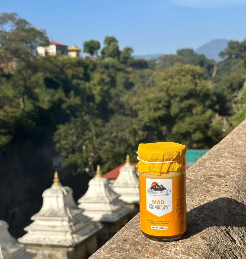 Mad honey is harvested by brave honey hunters from the cliffs of Nepal. It is produced by bees that feed on the nectar of rhododendron flowers, which contain compounds that give the honey its hallucinogenic effects It is known for its physiological effects, and when taken in low doses, it can cause dizziness, lightheadedness, and euphoria, while higher doses can lead to hallucinations, vomiting, loss of consciousness, seizures.